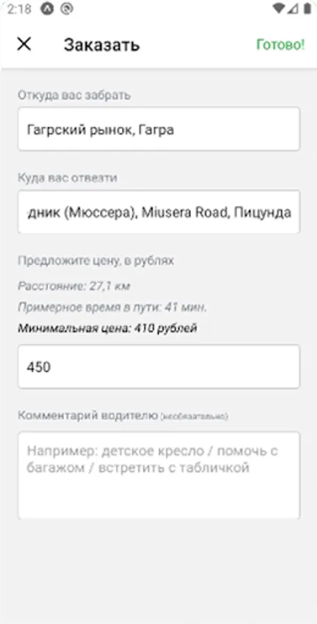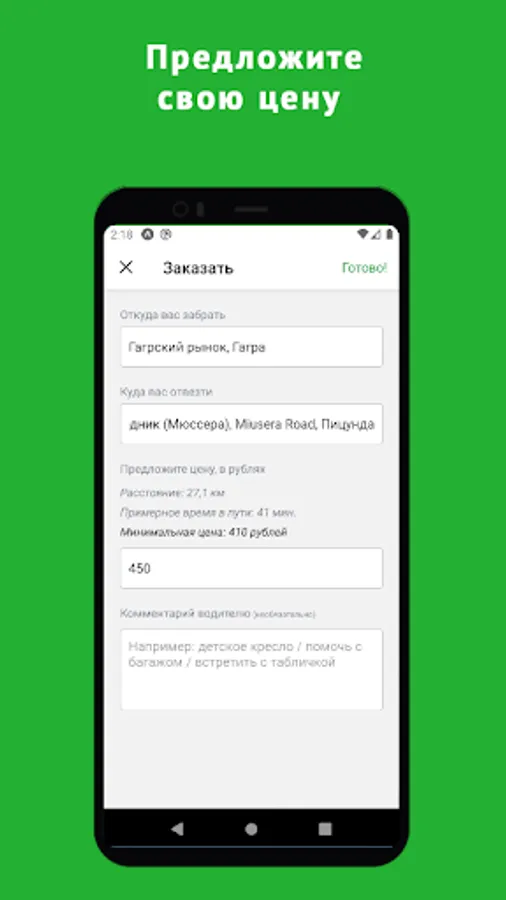 Just fill in the fields "From", "Where" and "Cost" which you define! Free drivers nearby will take you anywhere.