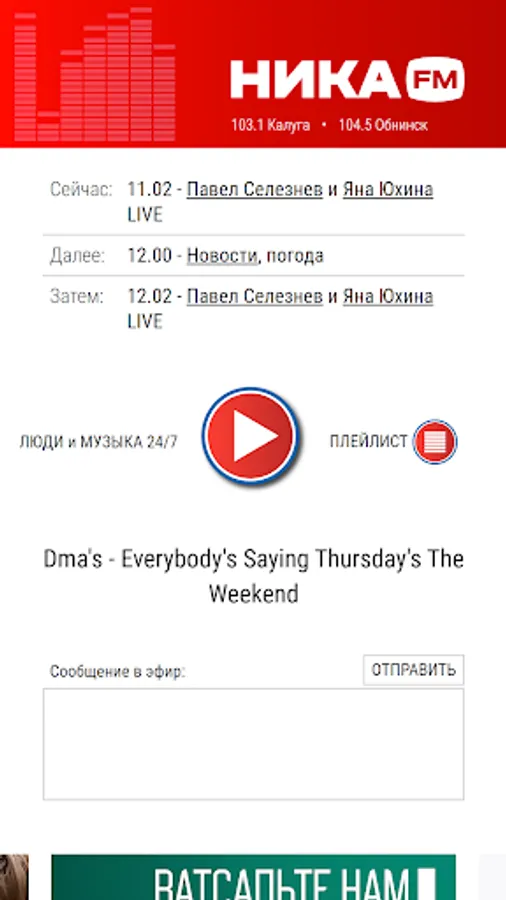NikaFM is an on-air music and information radio station. We have been working since 2004. Coverage area - the entire Kaluga region.