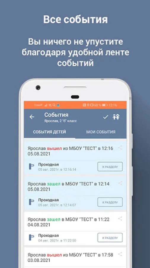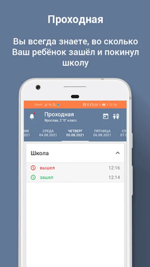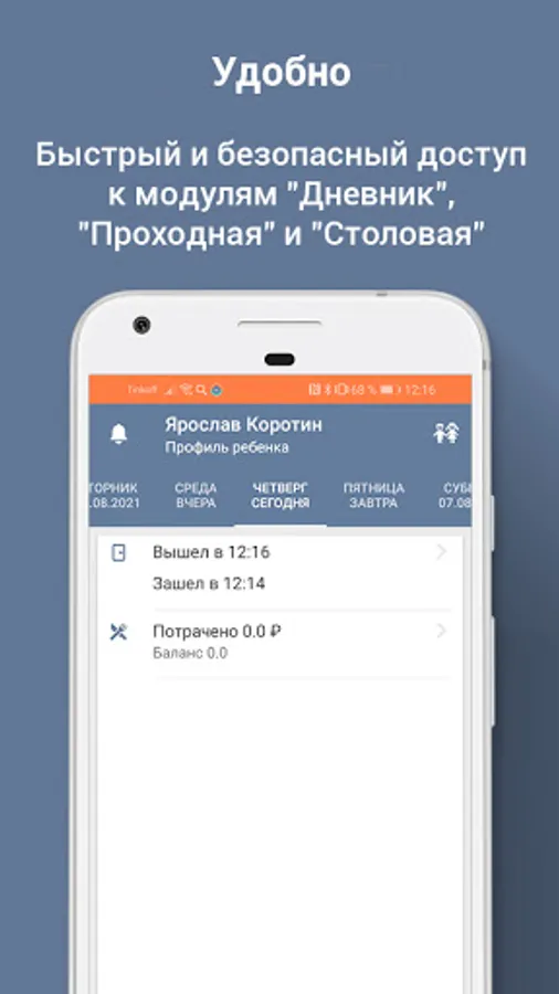 Parents can track information about their child's attendance at school, receive notifications about his entry and exit from school using push and e-mail notifications.