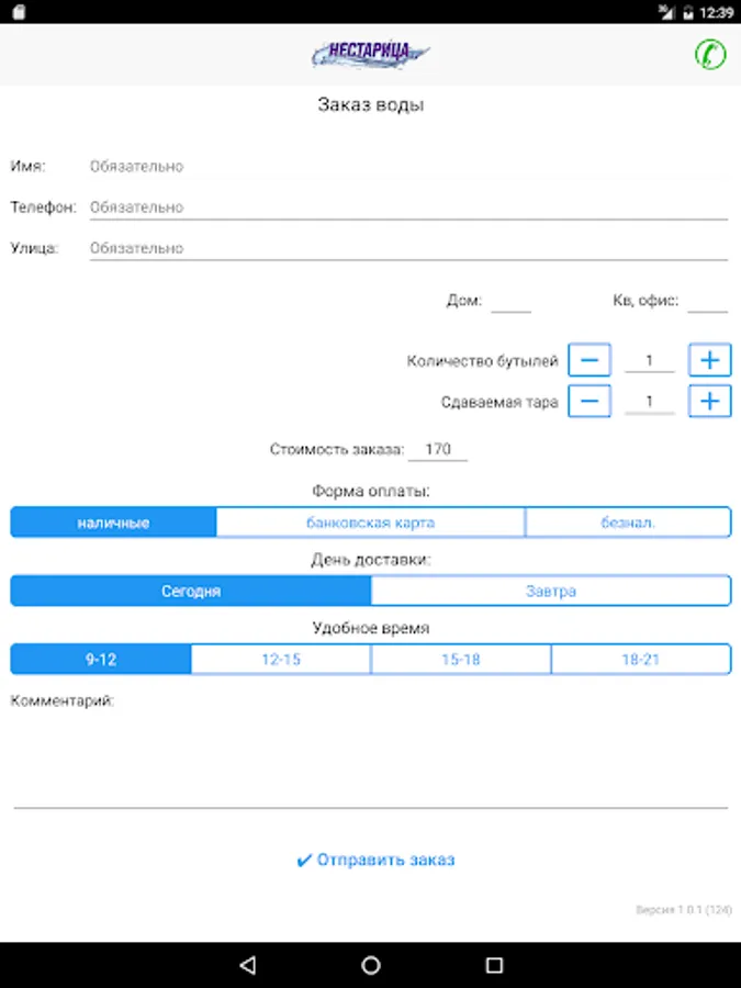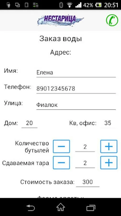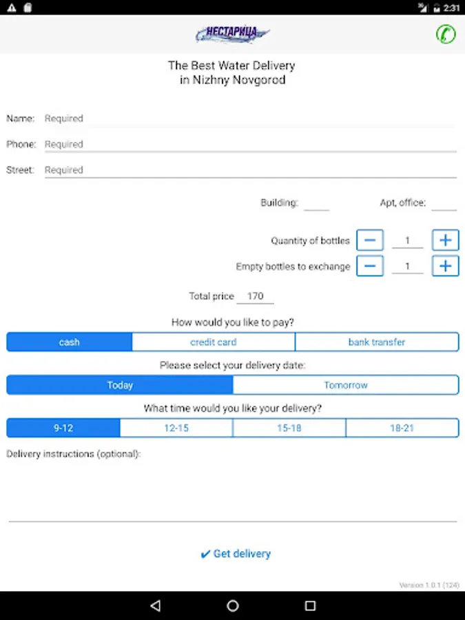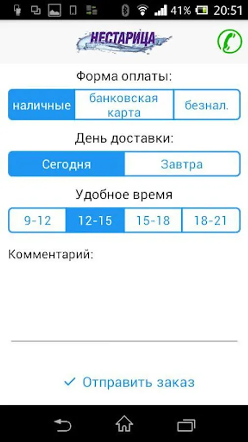 - delivery of water Nestaritsa is paid at your choice in cash or non-cash (from the current account of the organization, using the terminal to the courier or online when ordering in the mobile application).