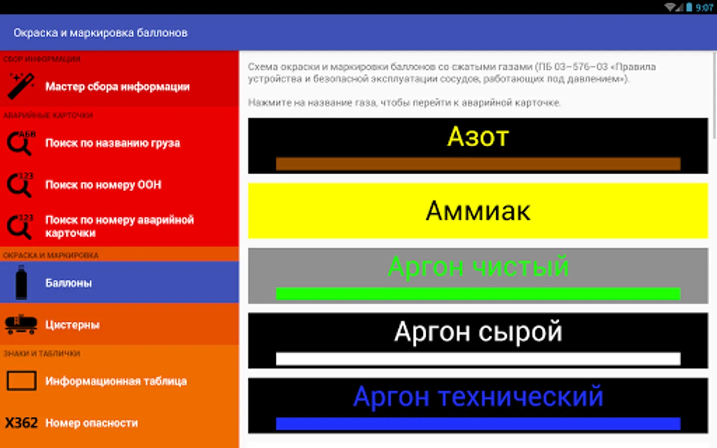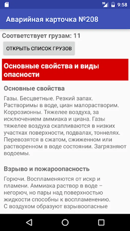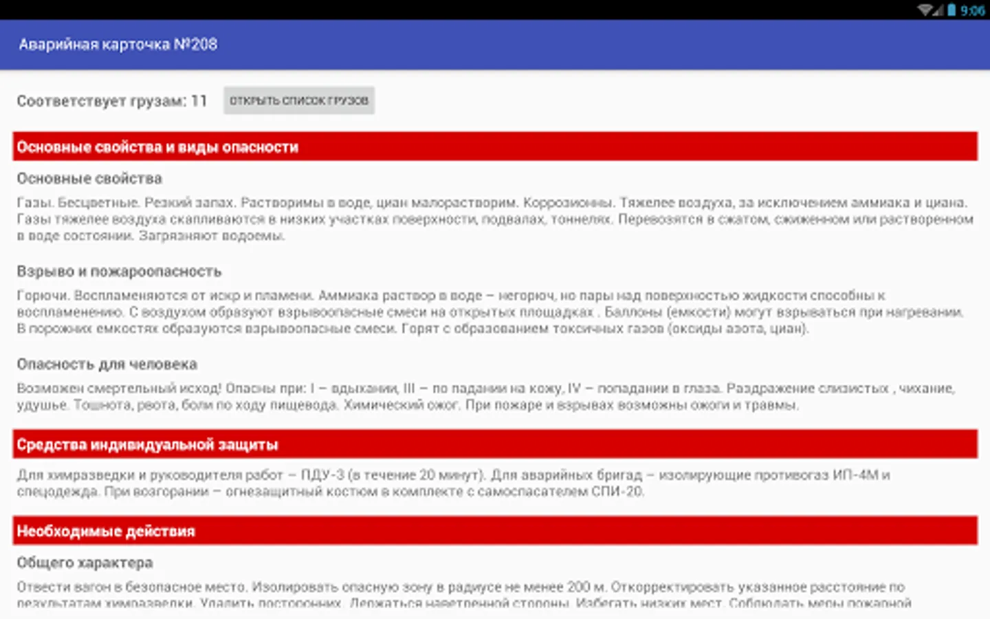 The program provides information on several thousand chemicals and products: basic properties, explosion and fire, the risk to humans, personal protective equipment, the necessary actions, neutralization, first aid.