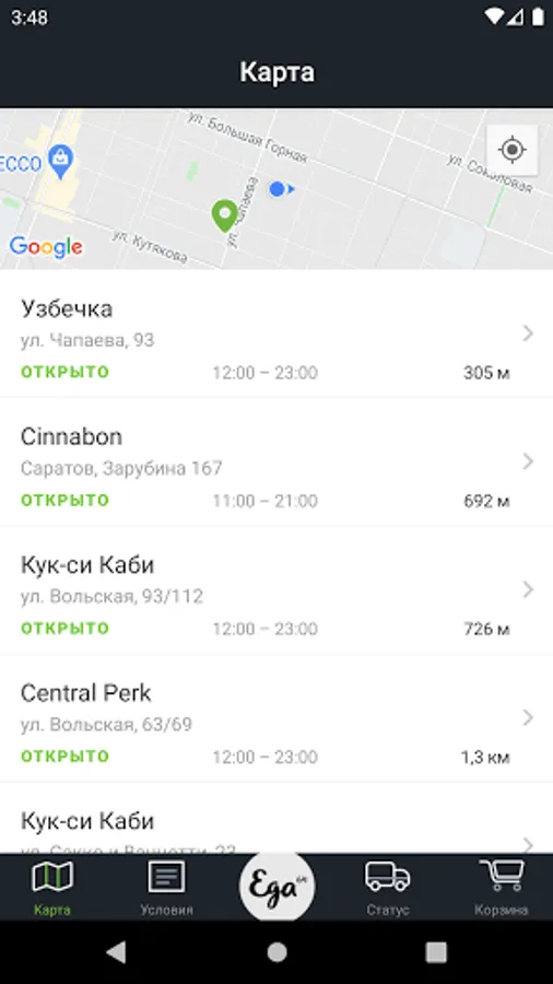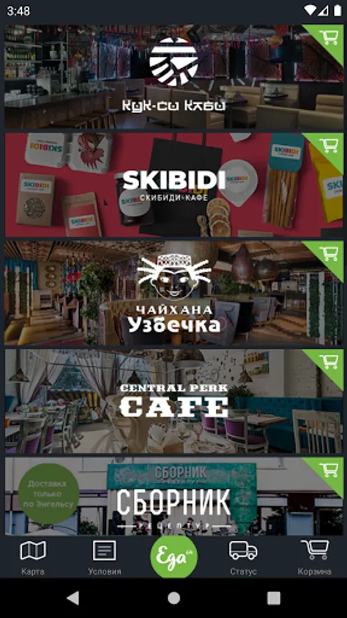 Now we are delivered from: Cook-si Kabi, Uzbek woman, HOUSE, Central Perk, THE BURGER, PIZZA64.