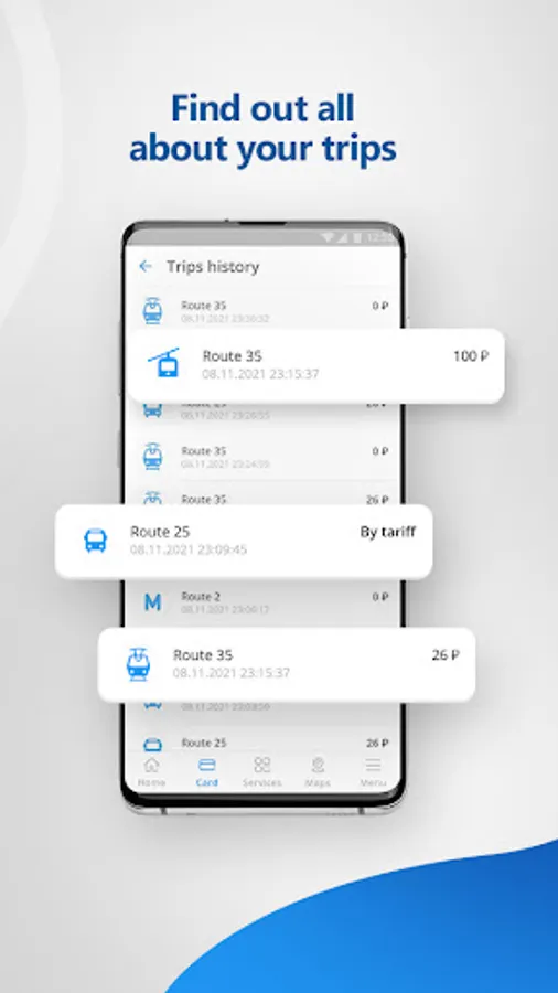 You can issue a virtual transport card in the app on phones with NFC. A virtual card with a favorable tariff is always at hand, top-up is instant and the balance is always up-to-date. The app allows you to issue multiple virtual cards. Conditions and the possibility of issuing virtual transport cards are determined separately for each region.