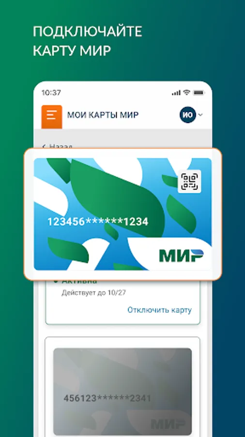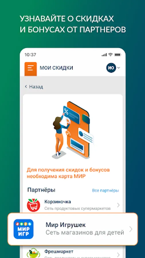 Connect your Mir card of any issuing bank in the application to receive discounts and bonuses, learn about available services, benefits and allowances