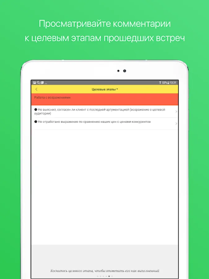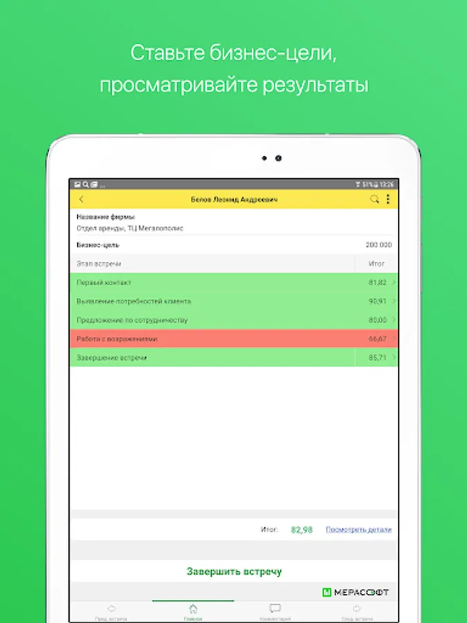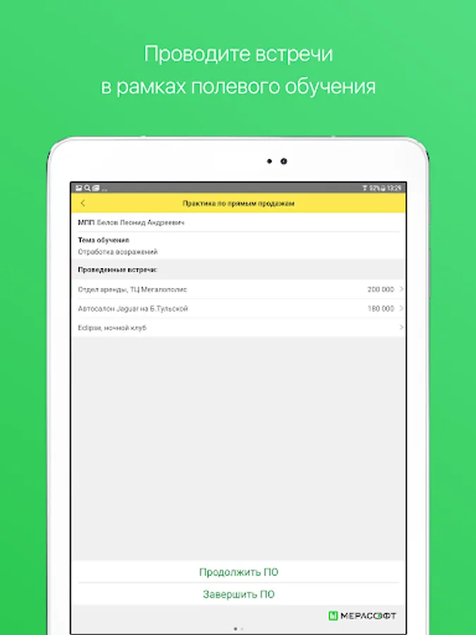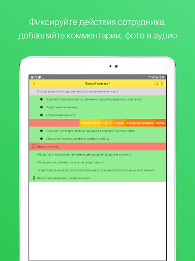 - Entering information about the meeting with the client, assessment of the implementation of company standards and the skills of the seller.