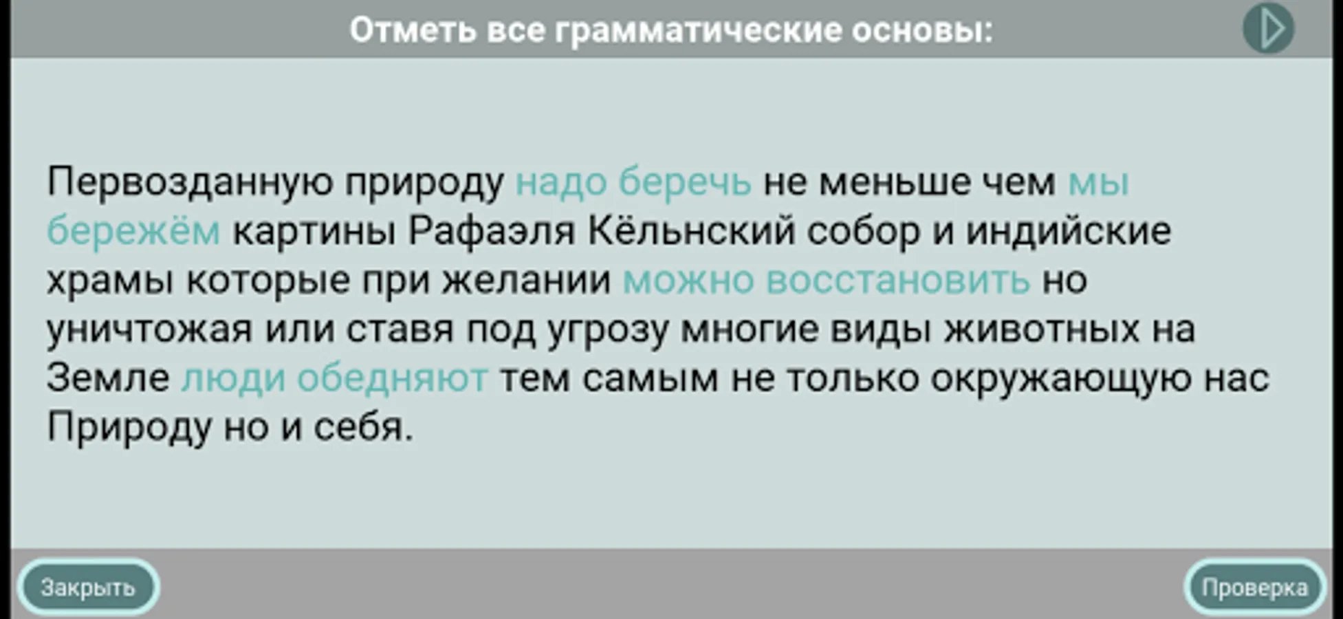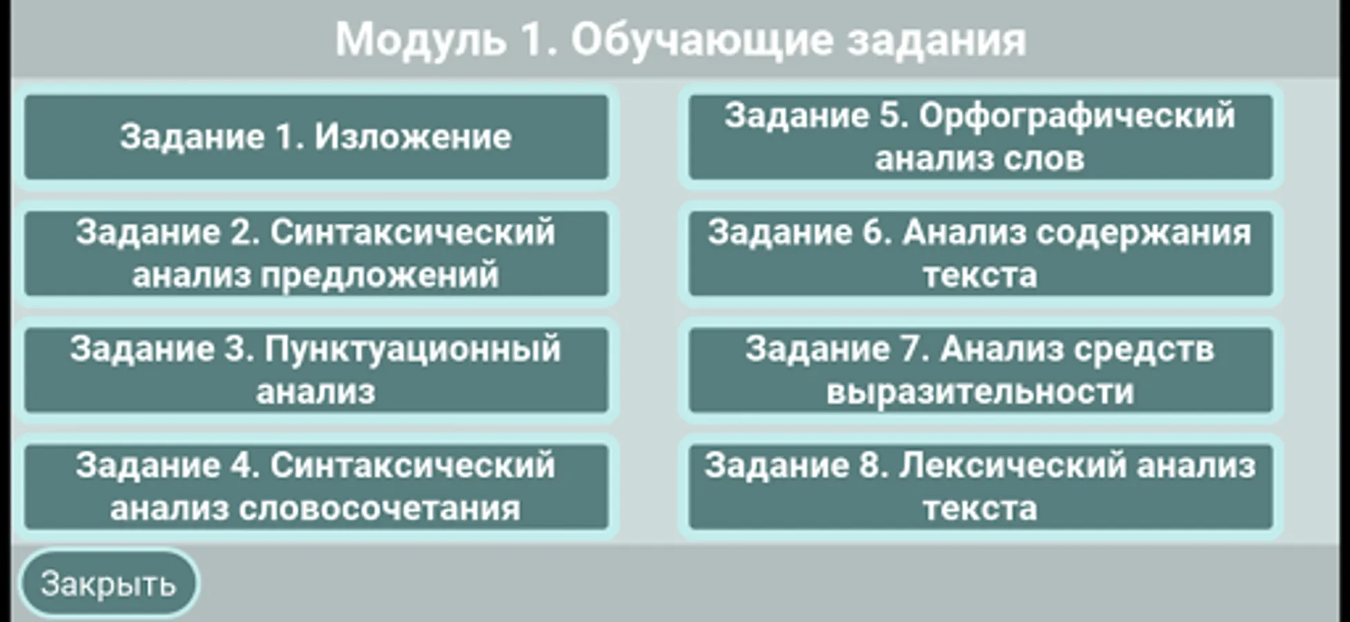 In the "Training" mode, training exercises are presented, grouped for each of the seven tasks of the test part of the OGE. Completing these exercises will provide you with quality and effective coaching for all assignments. The simulator provides the ability to instantly check the correctness at each stage of the exercise - this allows you to immediately see your mistakes. The training exercises are structured according to the principle of necessary and sufficient: they include only such tasks (in spelling, punctuation, grammar and vocabulary) that are provided for by control and measuring materials. This will allow you to focus on what is important to prepare for the exam. The structural and meaningful variety of our training exercises will help you develop and automate the skills necessary for consistently correct completion of the tasks of the test part of the OGE.