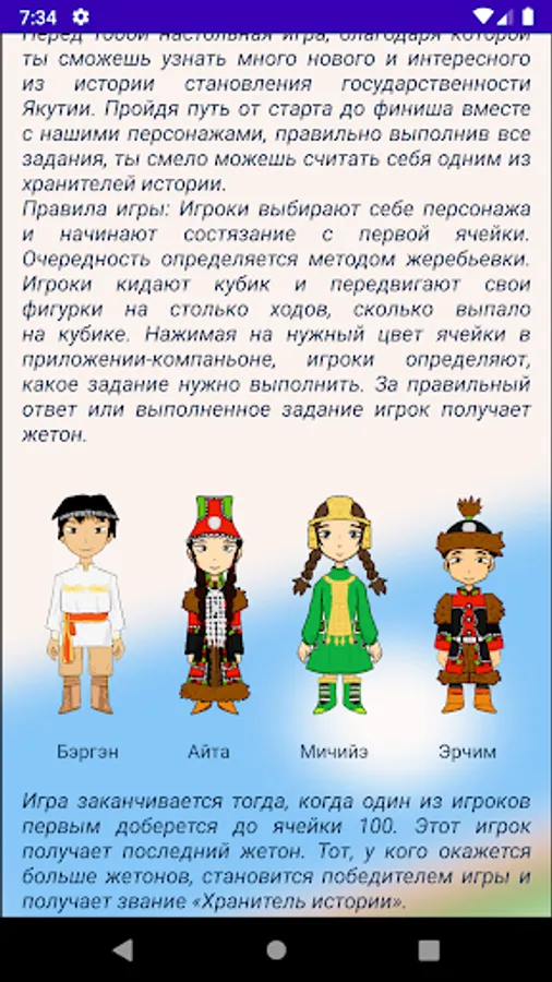 Before you is a board game, thanks to which you can learn a lot of new and interesting things from the history of the formation of the statehood of Yakutia. Having gone from start to finish together with our characters, having correctly completed all the tasks, you can safely consider yourself one of the keepers of history.