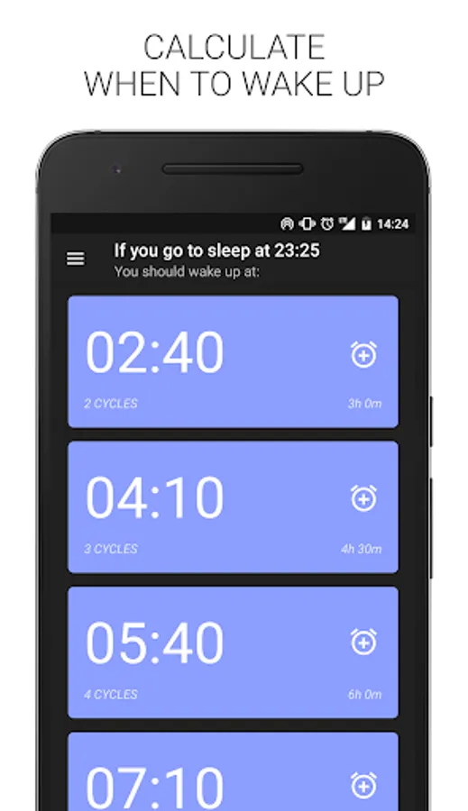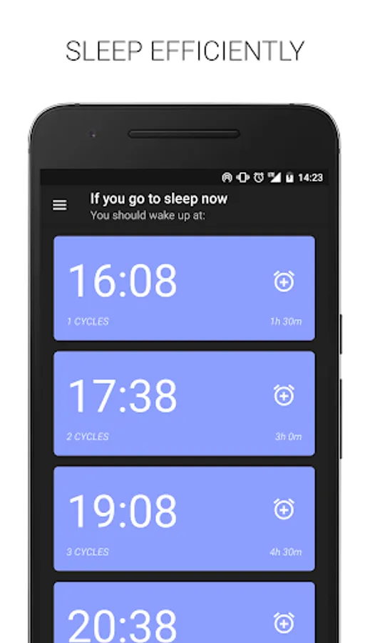 It is recommended to wake up at the end of a sleep cycle. Sleep Time helps you to calculate when to wake up or fall asleep to sleep efficiently and wake up feeling great.