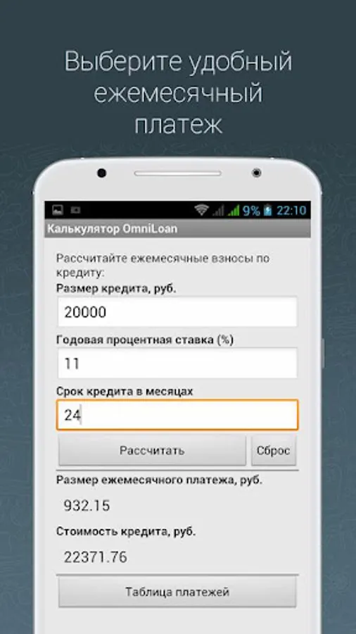 Loan calculator is designed to self-line calculation of the loan parameters such as the amount of the monthly payment and the total overpayment on the loan based on the desired amount for the borrower and the loan term and interest rate.