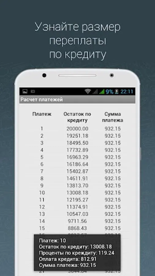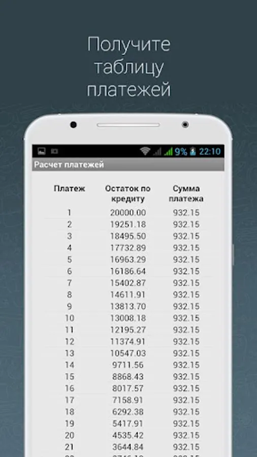 After calculation, you will receive a detailed schedule of payments, containing detailed information on each monthly payment, namely the total amount of the payment, how much of this amount goes to pay interest and to repay any principal, and principal balance.