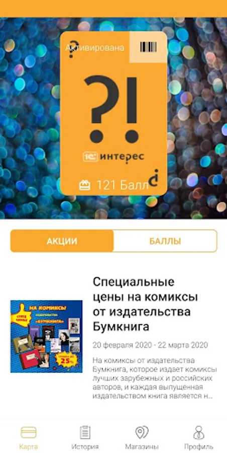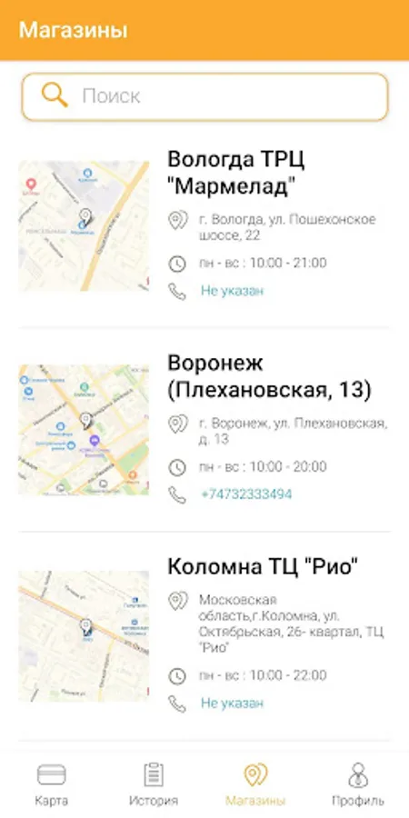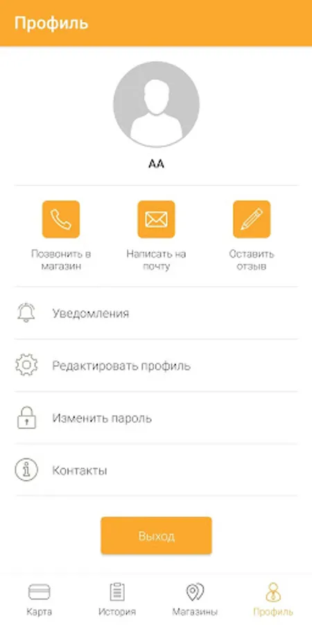 The application implements the ability to authorize a bonus card, displays information about promotions, purchase history, the number of points and the history of their accrual and deduction. Also available to users: a list of retail stores and the ability to search for the desired store at; customer profile, with the ability to leave feedback about the store or write to support mail.