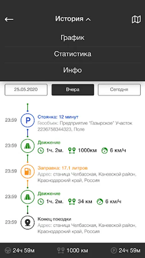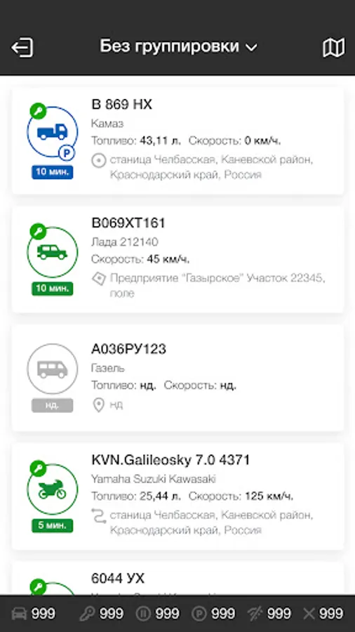 A mobile application for GLONASS satellite monitoring of transport, it is used for operational control over the movement of equipment, speed limits, daily runs, parking, fuel level, fuel consumption, engine speed, on-board network voltage, attachments, temperature and many other connected parameters. The application is convenient for use in everyday work for accurate planning and control of the operation of vehicles and special equipment, control of maintenance, timely completion of production tasks, as well as prevention of illegal trips and fuel theft.