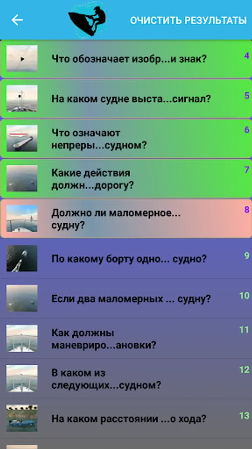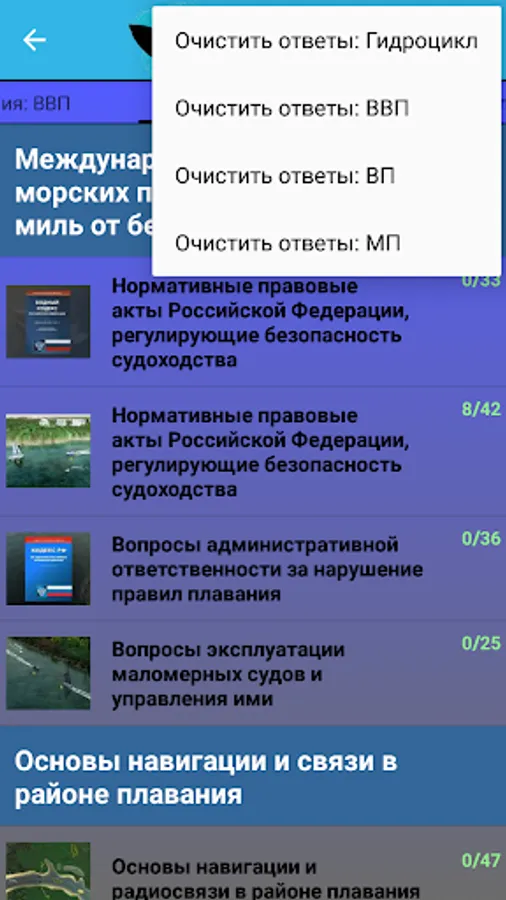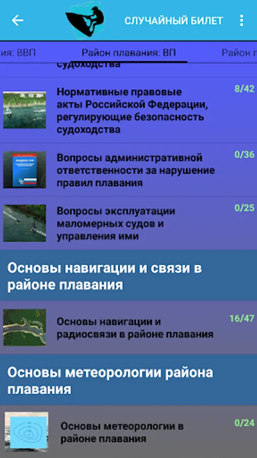 In the “Exam” mode, the ticket is formed in accordance with the principles of the Administrative Regulations of the GIMS EMERCOM of Russia. Each ticket for “Ship Type” includes two random questions from the first, third and fourth thematic blocks, three random questions from the second thematic block and one random question from the fifth thematic block.
