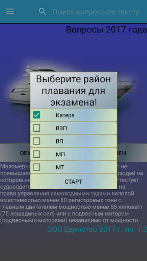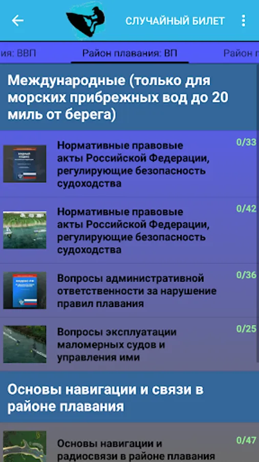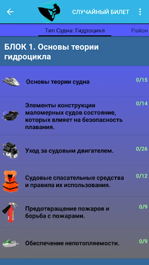 In the “Exam” mode, the ticket is formed in accordance with the principles of the Administrative Regulations of the GIMS EMERCOM of Russia. Each ticket for “Ship Type” includes two random questions from the first, third and fourth thematic blocks, three random questions from the second thematic block and one random question from the fifth thematic block.