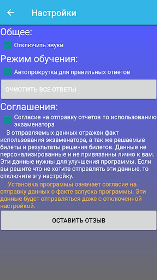 Two modes of operation. Training mode and Exam mode. Questions, sections and blocks in the “Training” mode are grouped exactly in the form in which they are provided by the Russian Emergencies Ministry's GIMS. Statistics of answered questions are kept, the program stores the results of answers to questions that can be cleared if necessary. Implemented the ability to search for a question by keywords.