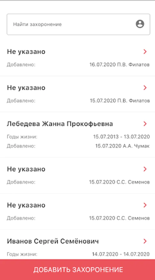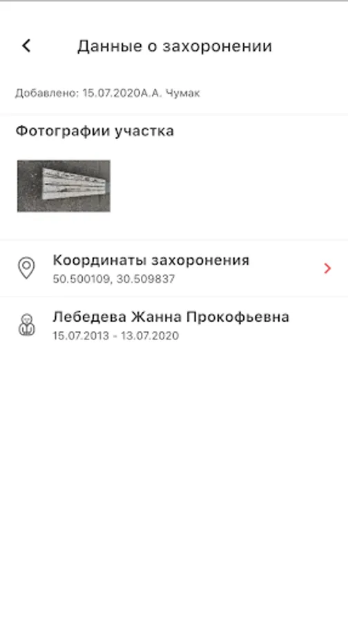 Application for searching and collecting public data in cemeteries: photos, location coordinates, name and date of life, contact details of the person in charge.