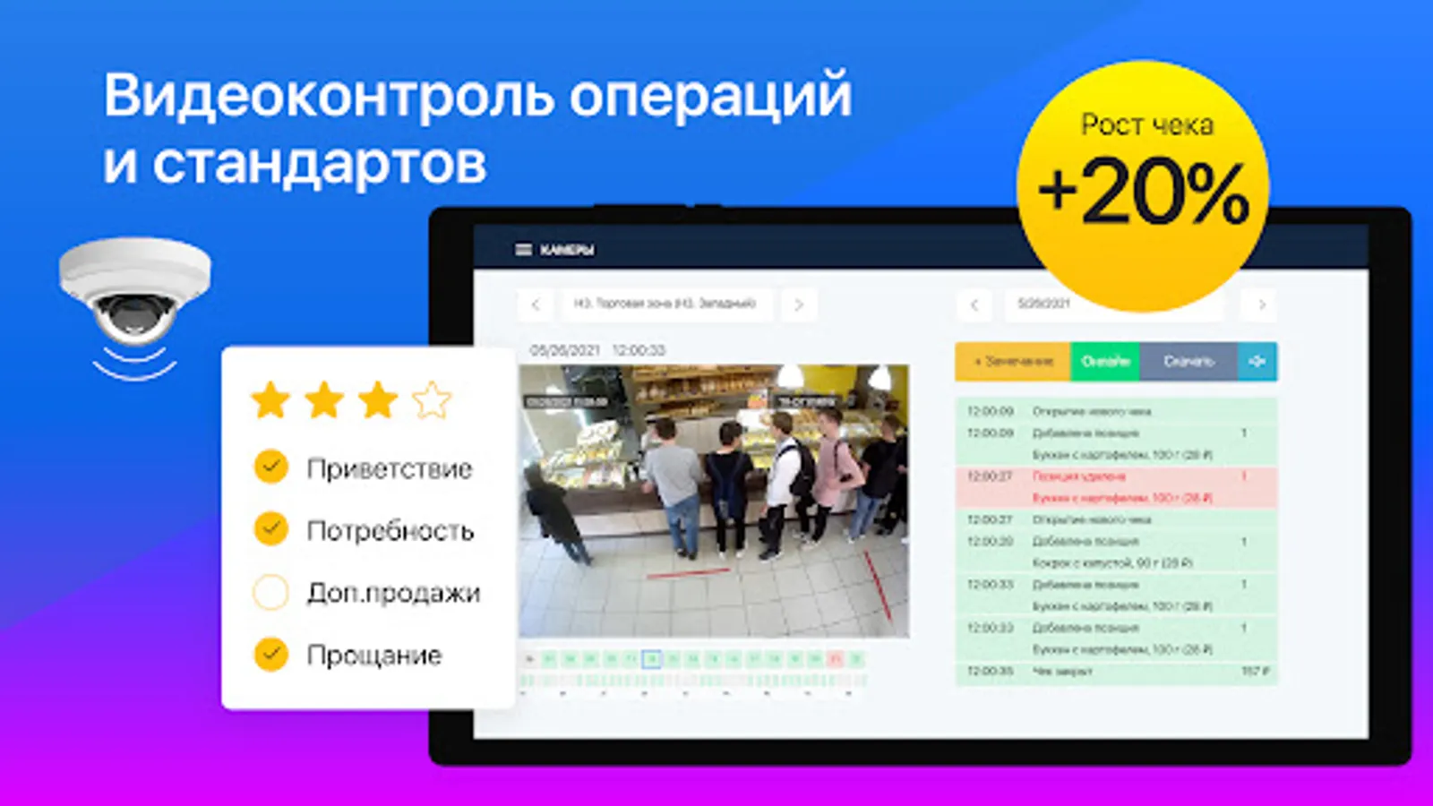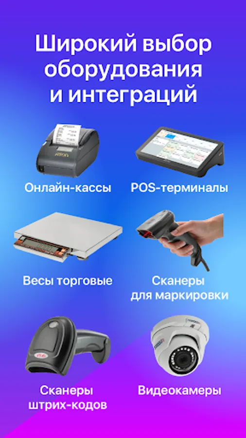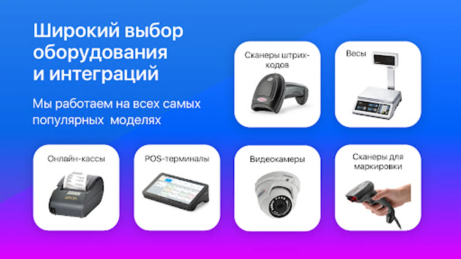 — a wide range of equipment for integration: online cash register, pos-system (pos-terminal with receipts, marking scanner, warehouse barcode scanner, etc.), trade scales, video cameras.