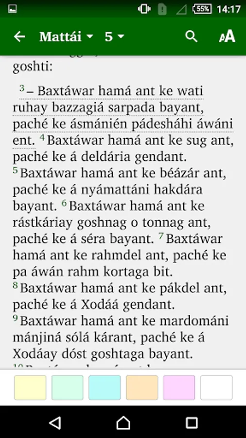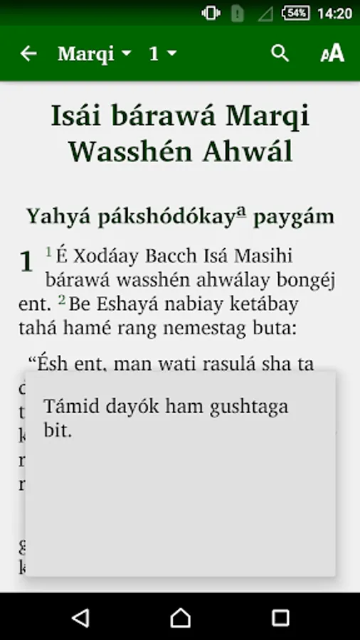 It facilitates the offline study of the Scriptures in Balochi. Users can highlight verses in different colors, place bookmarks, write notes and view the reading history.
