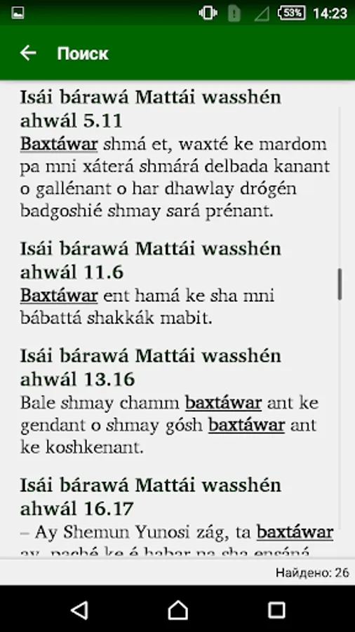 This app contains a preliminary version of the translation of the Gospels of Matthew, Mark and Luke into the Balochi language, produced by the Institute for Bible Translation.