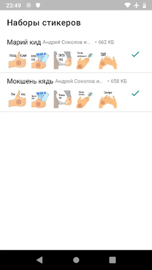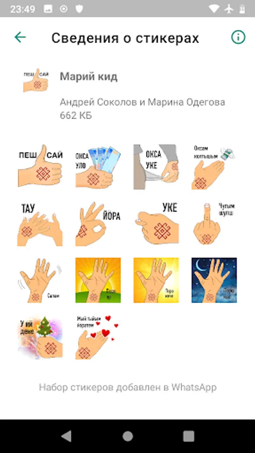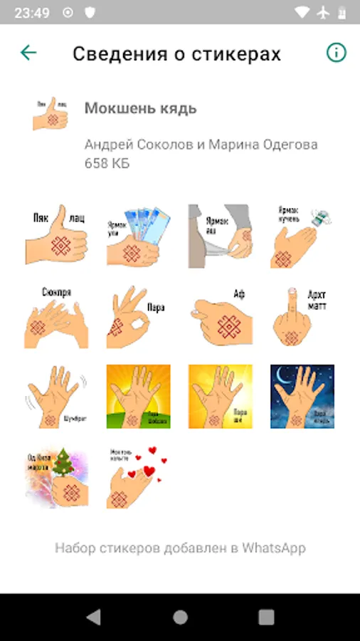 The application is required to add hand stickers to WhatsApp. There are two groups of stickers: with inscriptions in the Mari and Moksha languages.