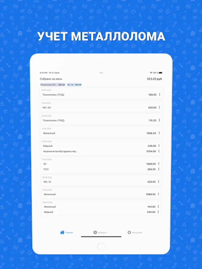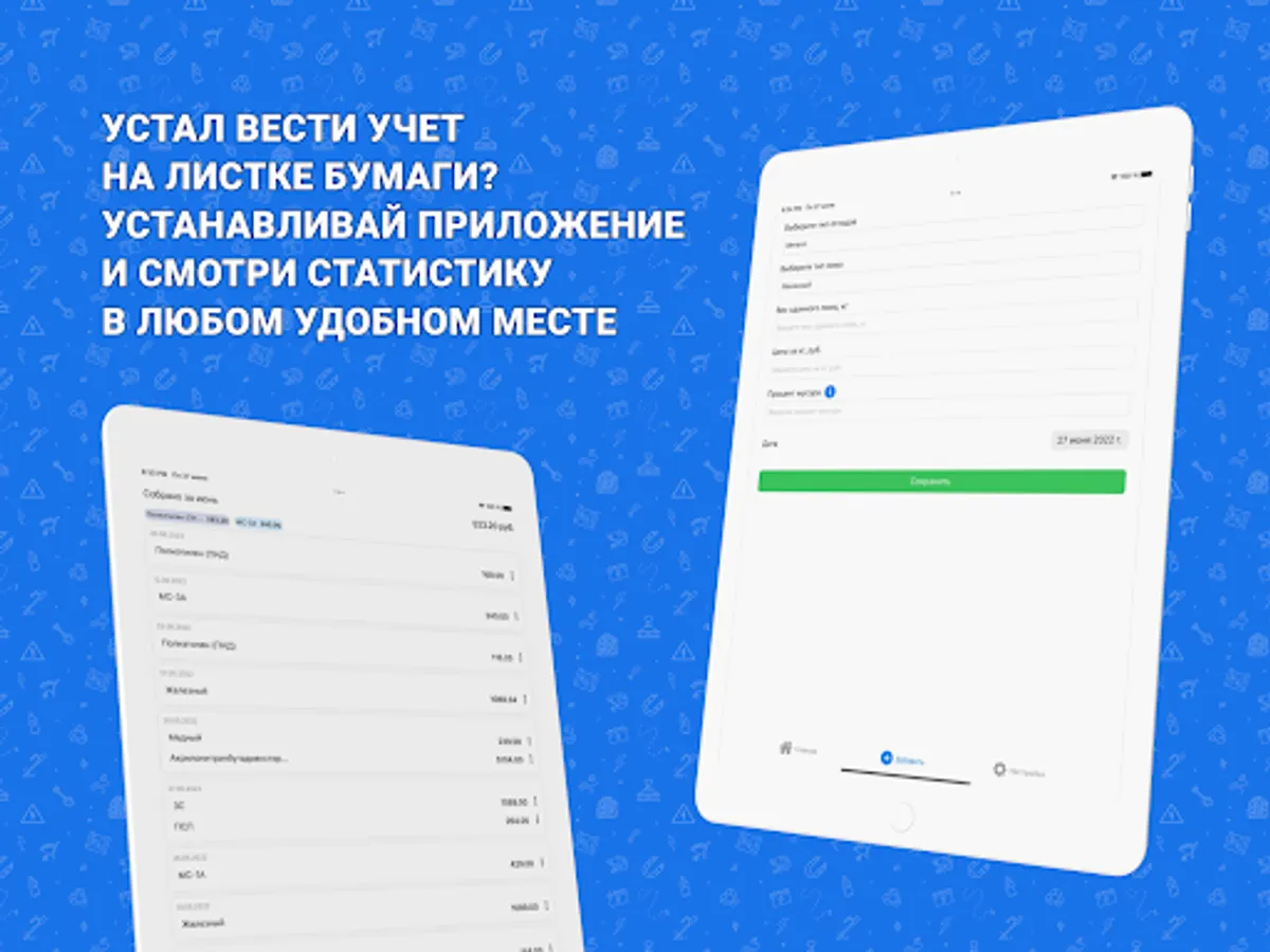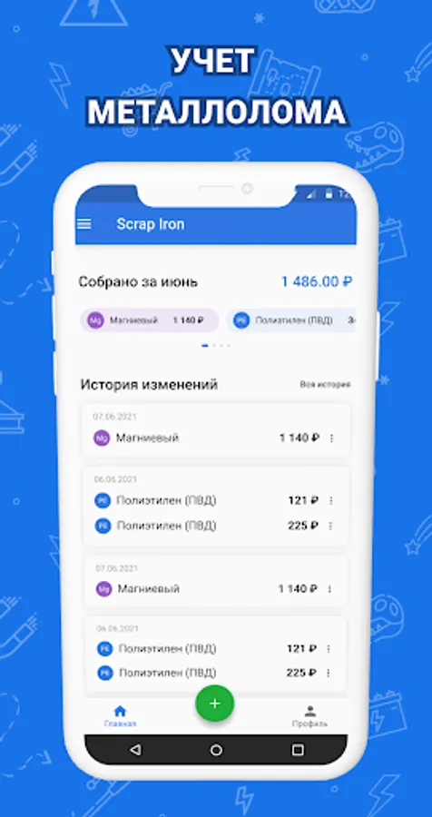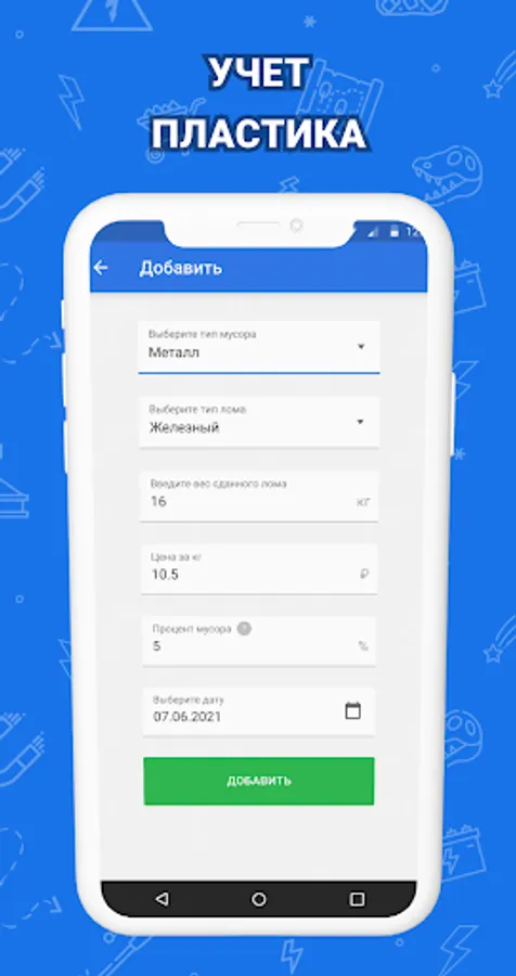 Application for accounting for separate collection and delivery of waste. When adding, you can indicate the date when you handed in waste paper, glass, tetrapacks, metal. Indicate the weight in kilograms, the price per kg for which you handed over ferrous metal (or non-ferrous metal or plastic / waste paper / glass). You can also specify the percentage of garbage, then this amount will be automatically deducted from the total. Thus, you can save how much, when and what kind of waste you collected, for how much you handed in. On the main screen in the dashboard, everything is summarized by the type of waste for the current month. In the future, you can choose your own time period.