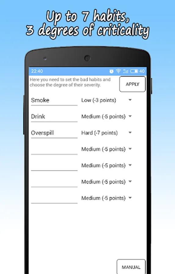 This application will help you get rid of the bad habits that make your quality of life worse. The essence of the application based on the famous "point" method. Fit into the bad habits the application settings (you can choose more than one) that you want to quit and mark each stall in the program. Then follow the points for a total score of all habits.