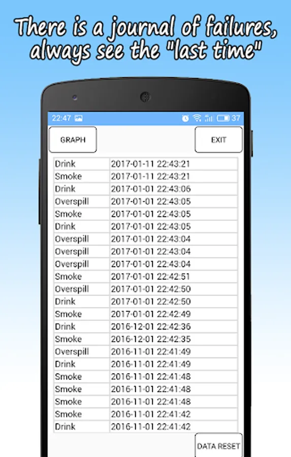 Success is considered, if the graph points each time increasing. If it falls or stands still - it is necessary to reconsider their behavior. Under addictions meant everything that you want to quit: smoking, drinking alcohol, drugs, wake up late in the morning, go to bed late at night, foul language, watching something forbidden, etc.