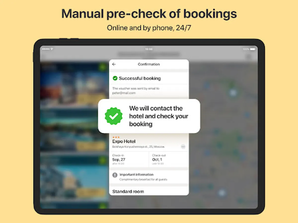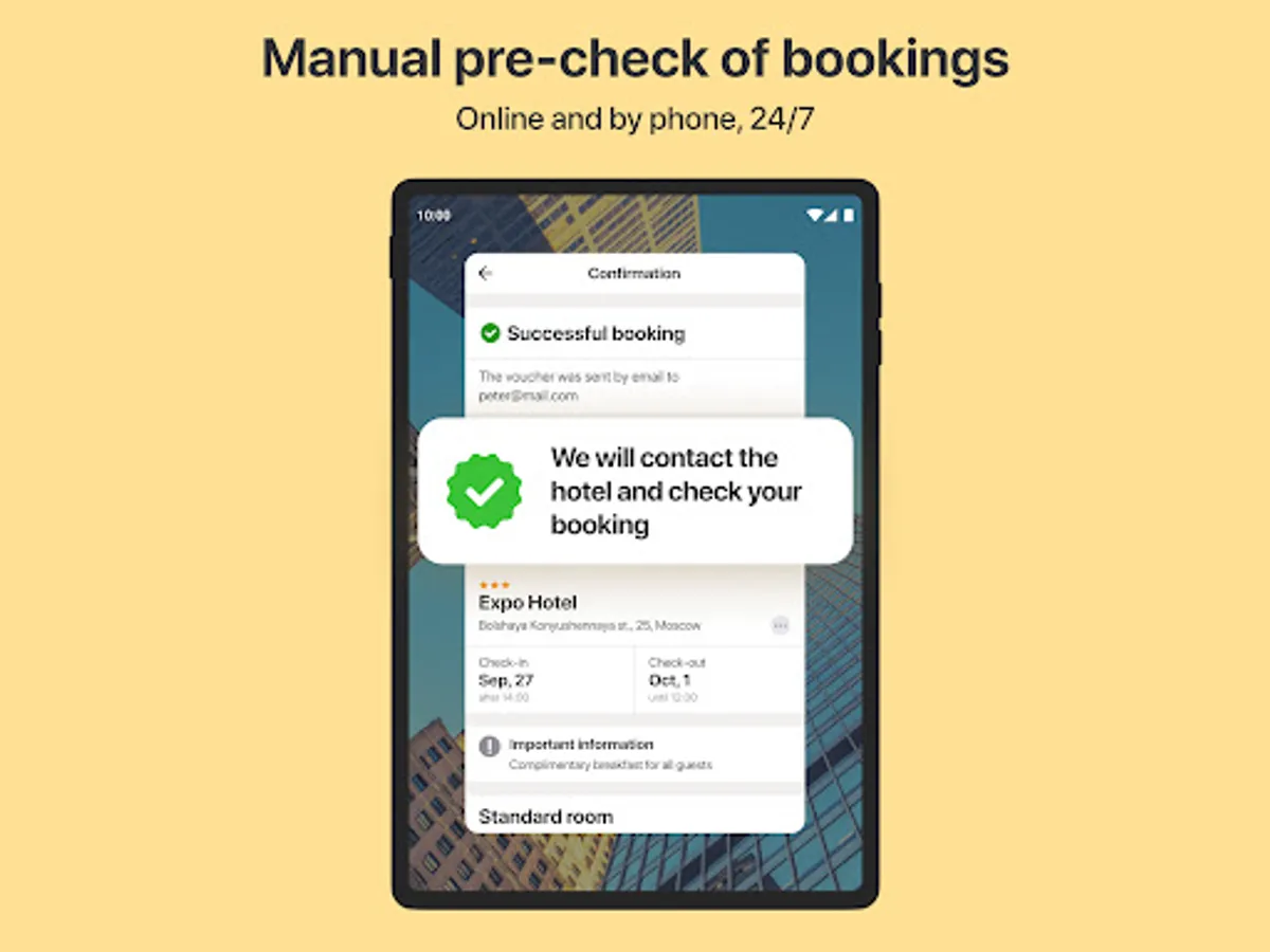 We guarantee maximum reliability. So that you can be sure that your clients are expected in the hotel, we carry out a manual pre-check of all bookings and recheck the details of each booking with the hotel.