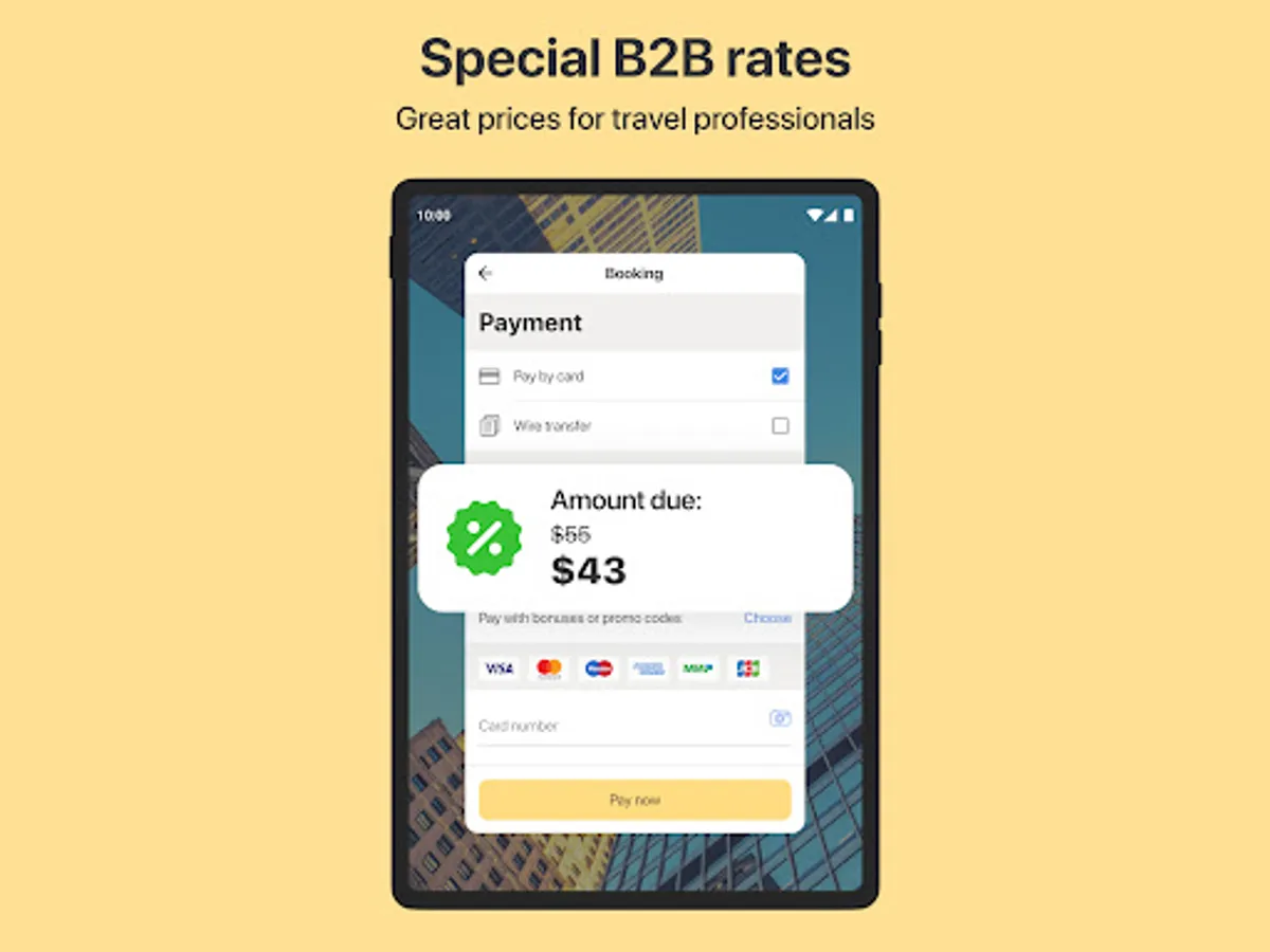 You can choose from over 1,300,000 hotels, guest houses, hostels, and apartments at great prices for corporate clients and travel agencies. We work with major global inventory suppliers and tens of thousands of hotels directly. This allows us to provide you with the best rates and save your money.