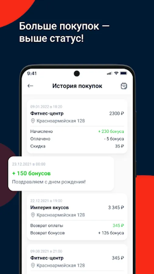 Get more bonuses by making great purchases at the Imperiya Vkusov supermarket, Wine Gallery wine boutique, Mon Plaisir restaurant, Amada Mia pizzeria, Le Grand fitness center, as well as with Program partners.