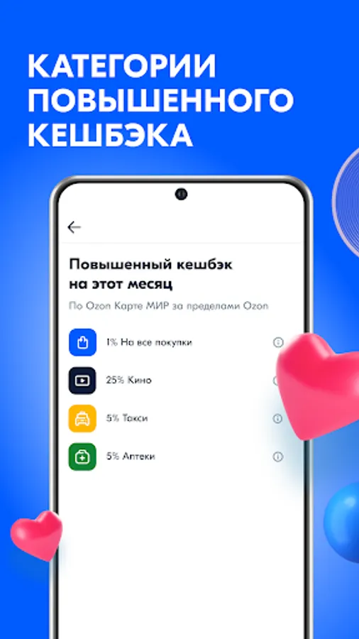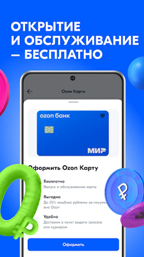 Откройте бесплатную банковскую Ozon Карту в мобильном Ozon Банке, и вы сможете получать кешбэк за покупки даже за пределами Ozon. До 25% — в категориях повышенного кешбэка, 1% — за остальные покупки за пределами Ozon.
