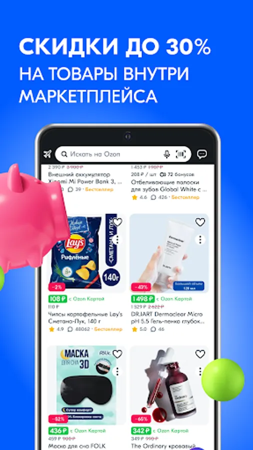 Помимо повышенного кешбэка за пределами маркетплейса, воспользуйтесь скидками до 30% на покупки внутри Ozon при оплате Ozon Картой.