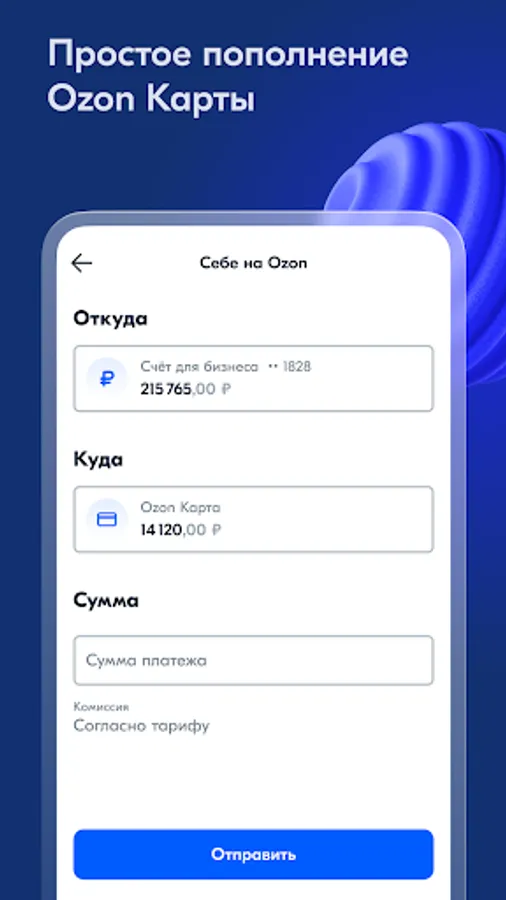 - Send money to counterparties, individuals or yourself to Ozon Card