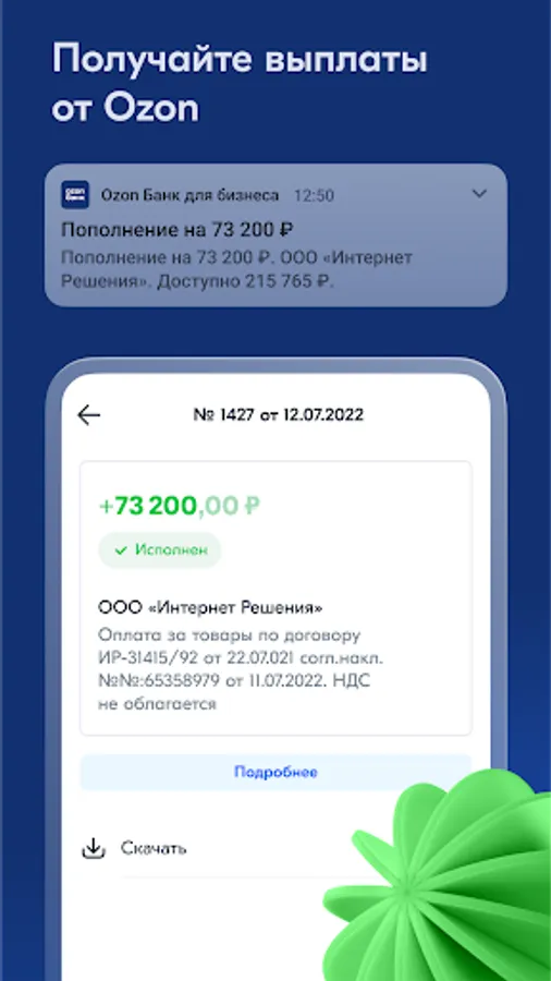 Ozon Bank for Business is an online bank for individual entrepreneurs - sellers on the marketplace. In the application you can: