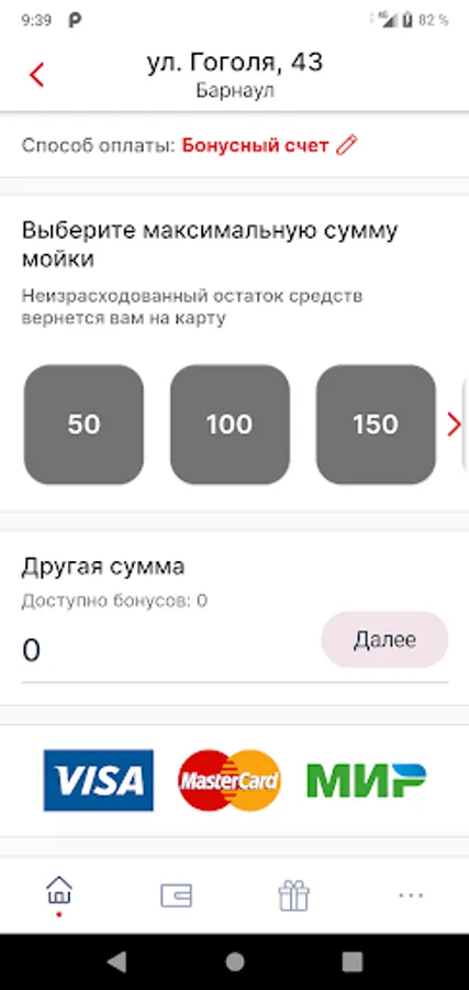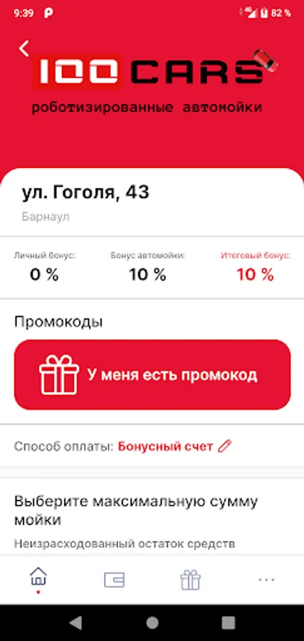 With the help of the mobile application, you can save up bonuses and pay up to 100% for the car wash. Bonuses are awarded both in cash and by bank transfer.