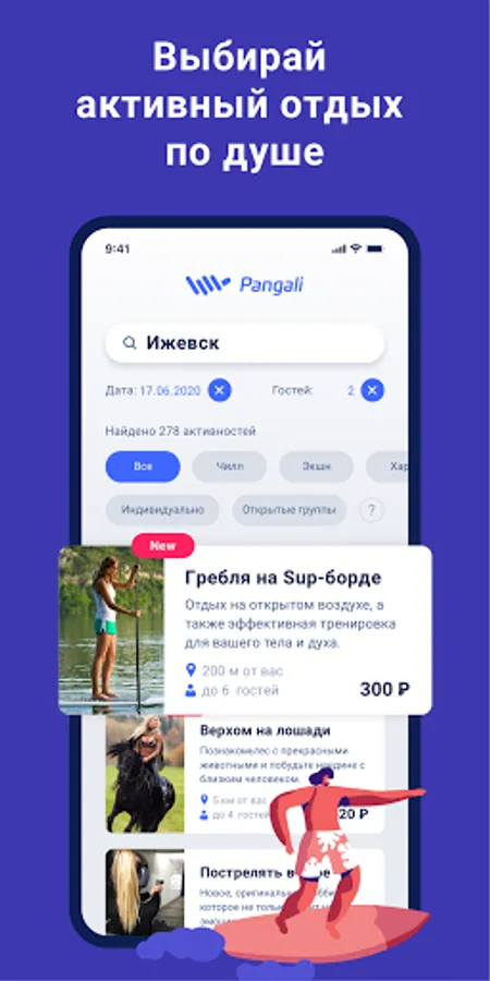 Pangali is an application that will become your best assistant in finding interesting activities in Russian cities. Convenient and simple interface will allow you to organize exciting leisure in a matter of minutes. You no longer have to sit for hours in search engines and make an incredible number of calls to find a decent vacation at the best prices.