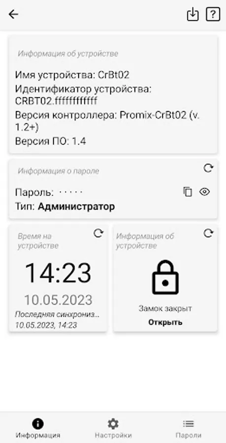 - saving controller parameters and passwords to the phone's memory for further viewing without connecting to controllers.