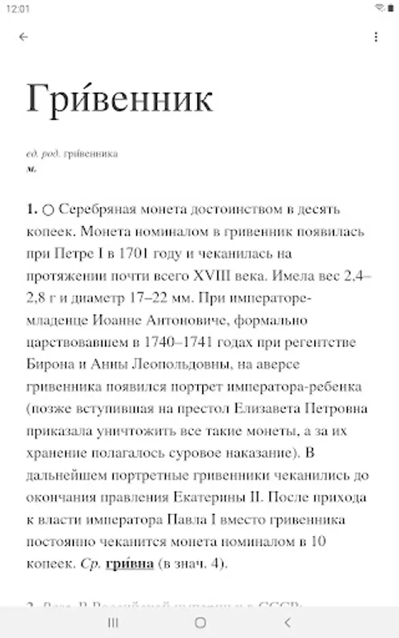 The dictionary connected to the reader contains interpretations of a total of 11,000 non-frequent nouns, the understanding of which is fraught with significant difficulties for modern readers. Each dictionary entry contains, in addition to interpretations, orthoepic, grammatical and etymological information about the word. The dictionary includes two modules.