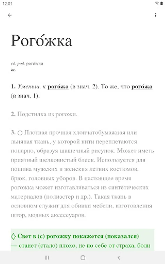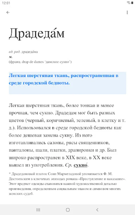An auxiliary, lexicographic module is used to clarify the meanings of those difficult words for which the articles of the main module are not yet ready. The module contains about 10,000 nouns, the interpretations of which are imported from the site "Gramota.ru" and brought to a single, easy-to-read lexicographic format. New articles of the main module, as they appear, will automatically replace articles in the auxiliary module in the application.