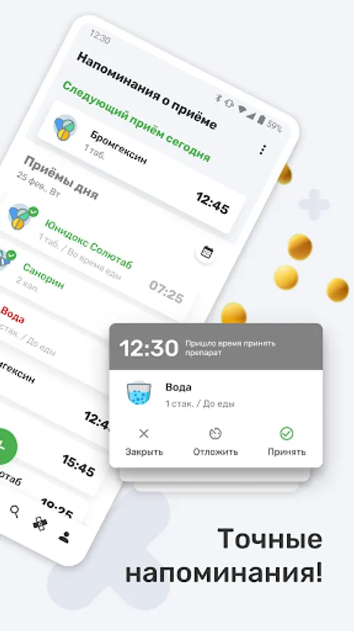 You can easily create reminders about taking medications, vitamins and dietary supplements, as well as about taking water, meditating, exercising, going to the doctor and much more. Set up a convenient appointment schedule in just a minute. If you constantly forget to buy a medicine during a long course, then the application will help you. Just turn on the reminder to buy a medicine, and at a convenient time for you, the application will remind you when you need to buy a medicine!