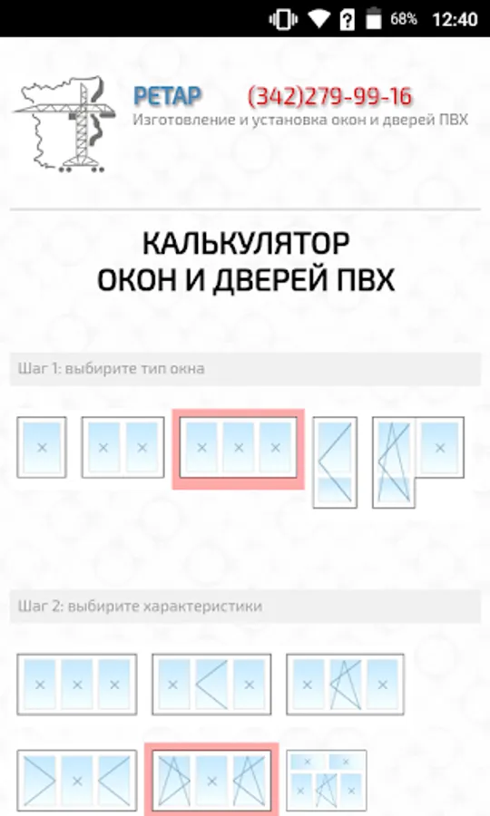 Online service for the calculation of the cost of PVC plastic windows and doors of various set parameters (size, number of sections, opening shutters and mikroprovetrivaniya, accessories and additional items).