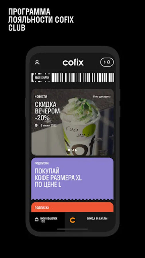 Check-in with every order (read the barcode at the checkout), get bonus cashback and other privileges of the Cofix Club loyalty program.