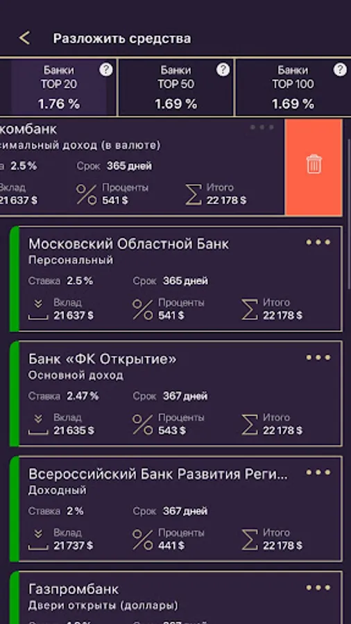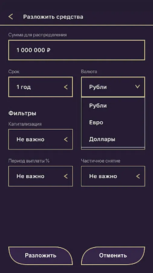 This version of the application does not take into account deposits with a variable interest rate, as well as deposits, the opening of which requires the fulfillment of additional conditions.