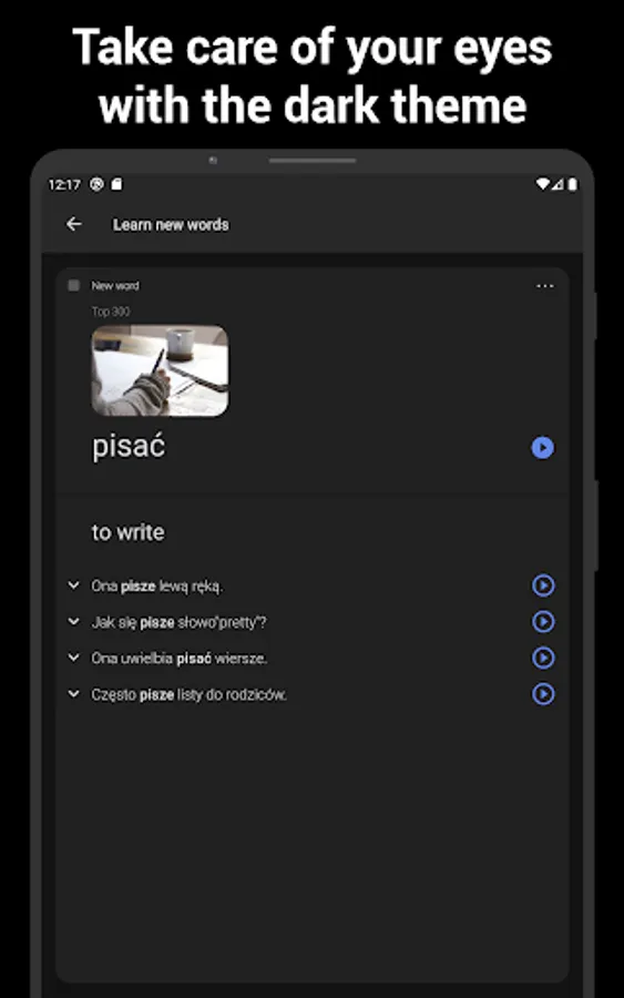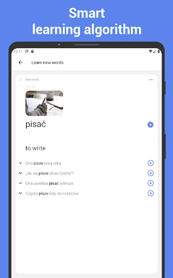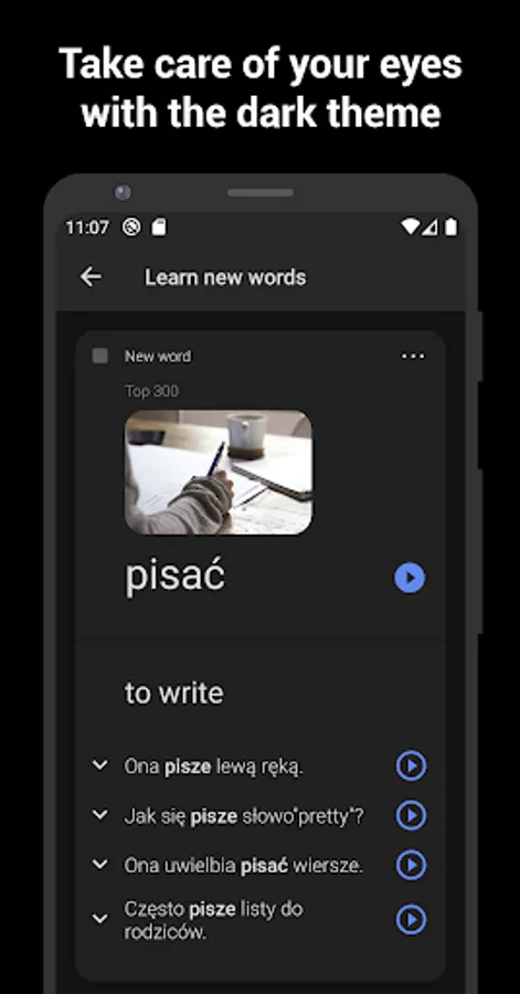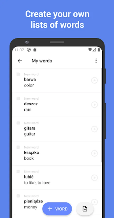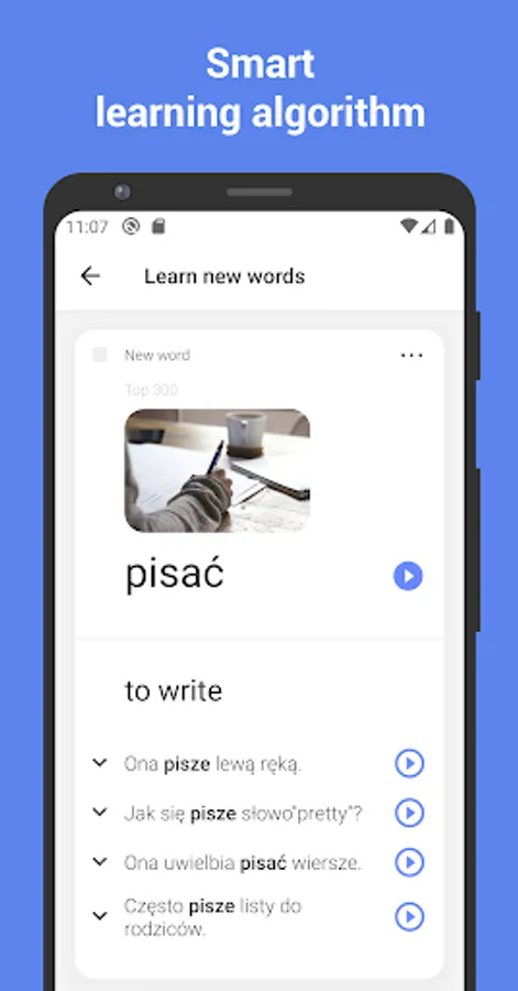 Use the app at least twice a day, with regular breaks every few hours. Start with just five words a day and you will have at least 1,825 new words in your active vocabulary within a year. Increase your daily goal, take more Polish lessons, and you will accelerate your progress and learn Polish even faster.