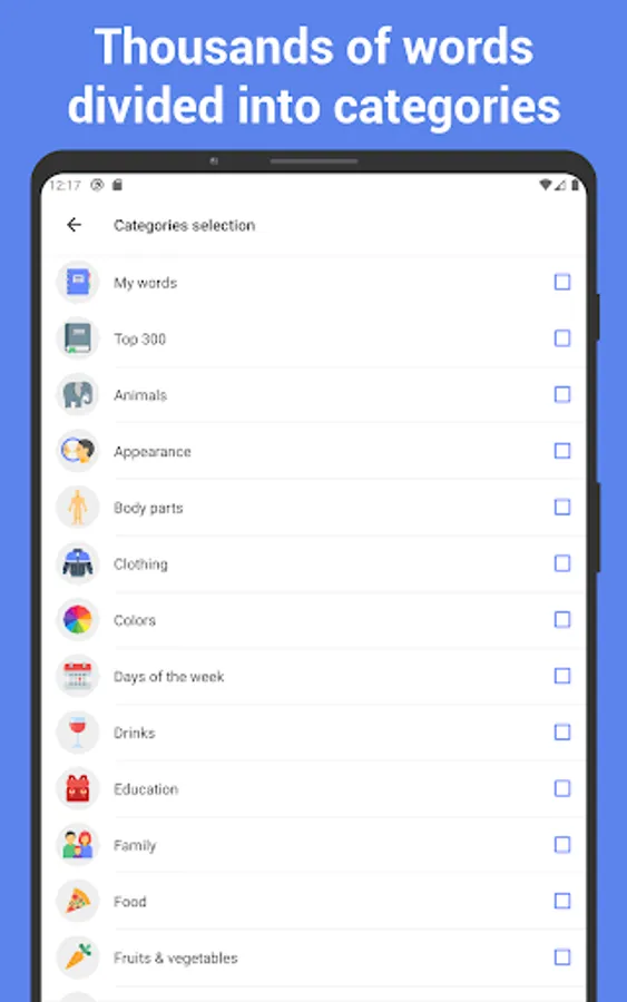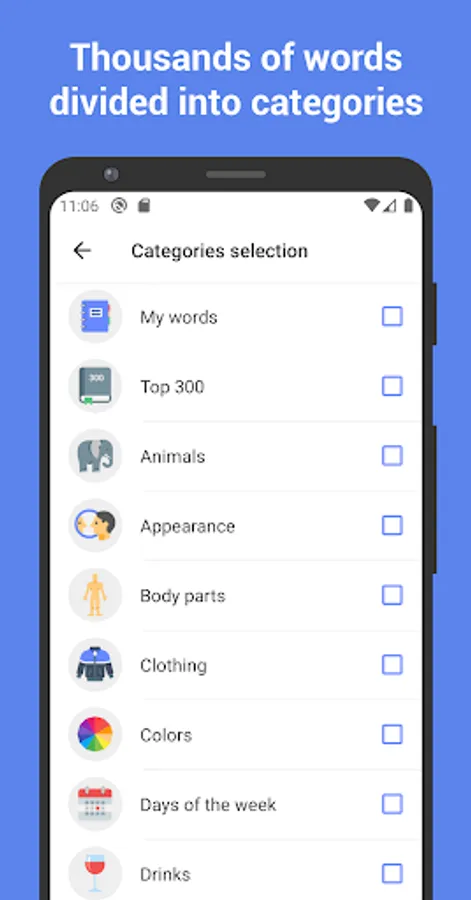 • Thousands of Polish words and phrases divided into thematic categories: choose the category you want to learn this time and change it whenever you want.