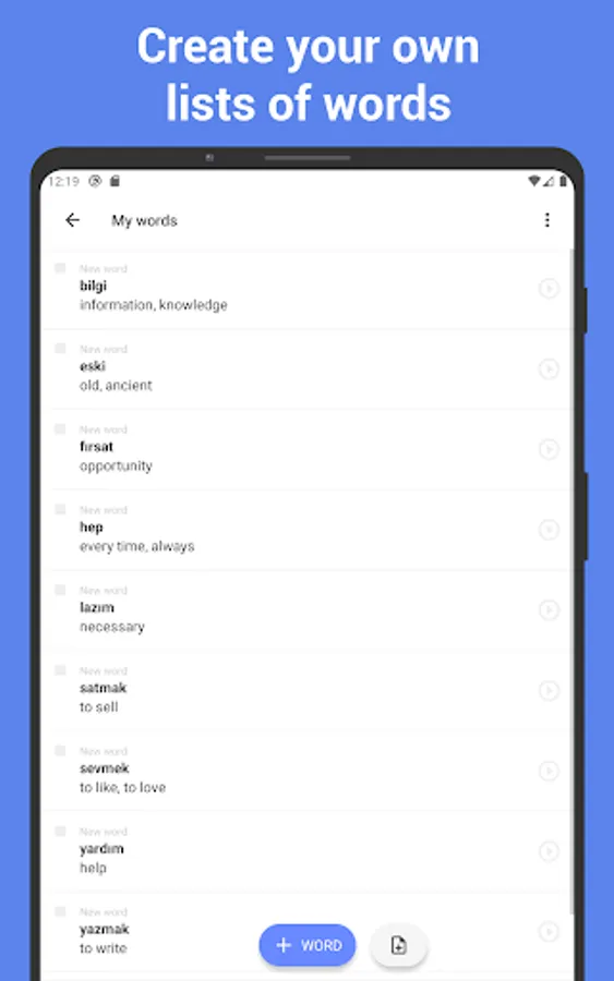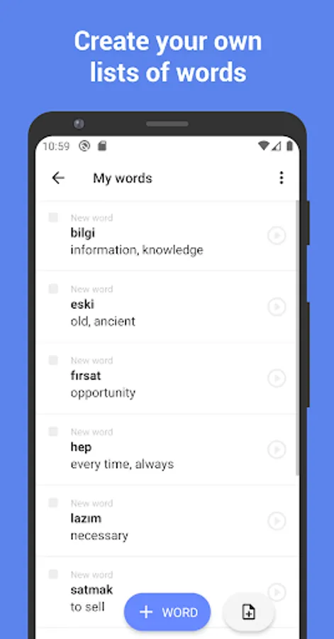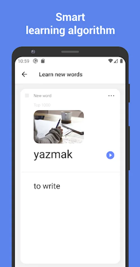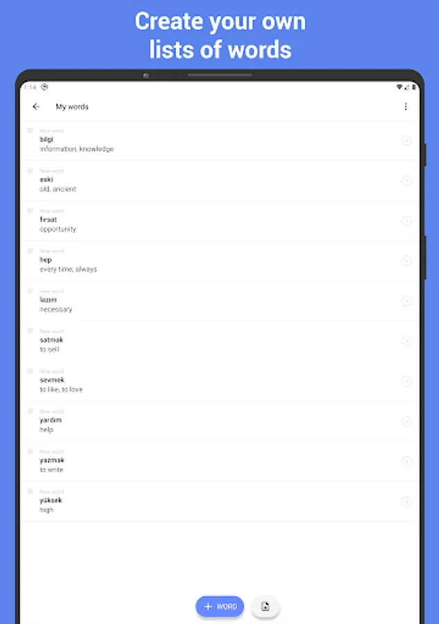 ReWord is a highly effective foreign language learning app. It is your best tool to learn Turkish and improve your vocabulary. Did you know you can learn languages just taking 5-10 minutes a day? With our interval system, your Turkish lessons will reach a new level. And will give you greater results, of course!