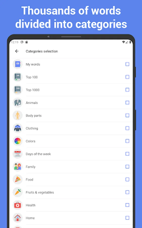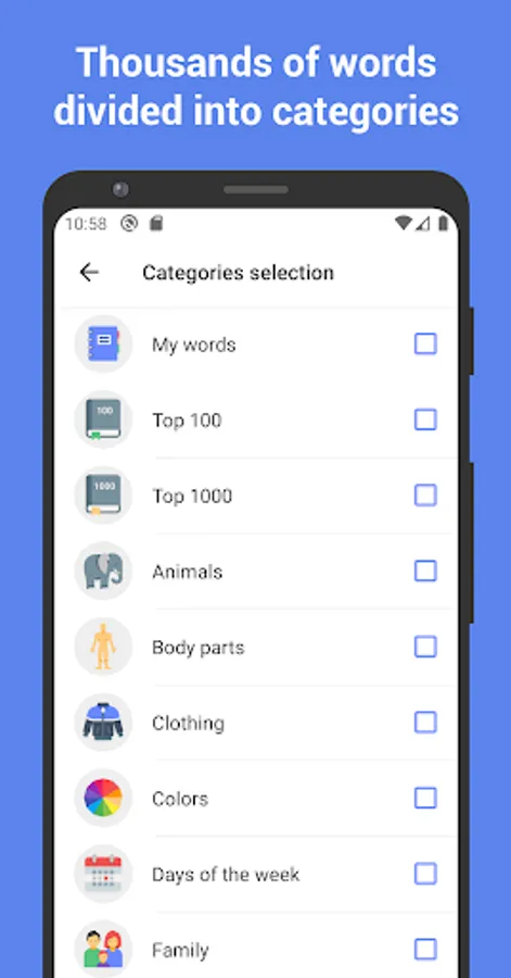 • Add your own words and categories easily: you can create your own word base you want to master first.