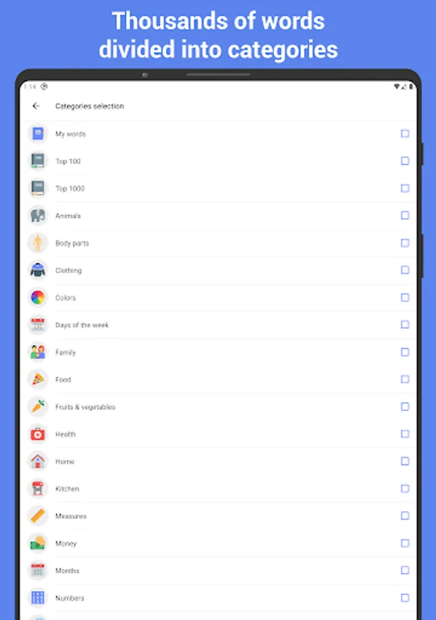 • Thousands of Turkish words and phrases divided into thematic categories: choose the category you want to learn this time and change it whenever you want.