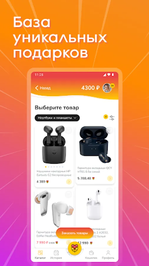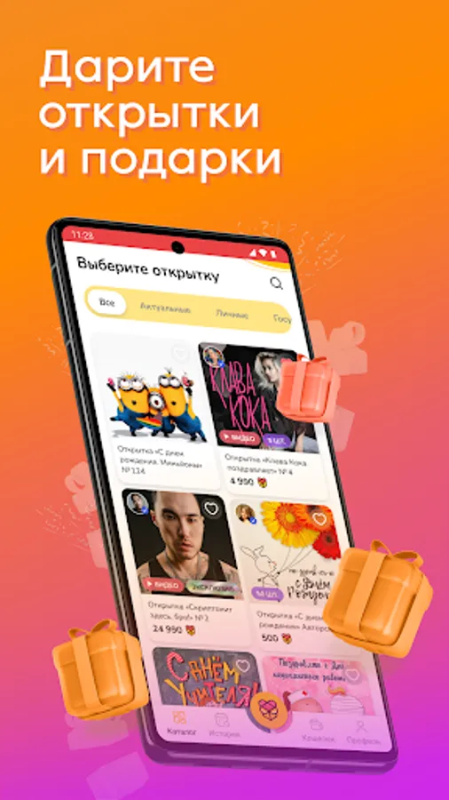 The application has a huge selection of cards and gifts for any occasion. You no longer need to think about what to give: send congratulations with bonuses, the recipient himself will choose what he wants in the application's huge catalog of gifts.