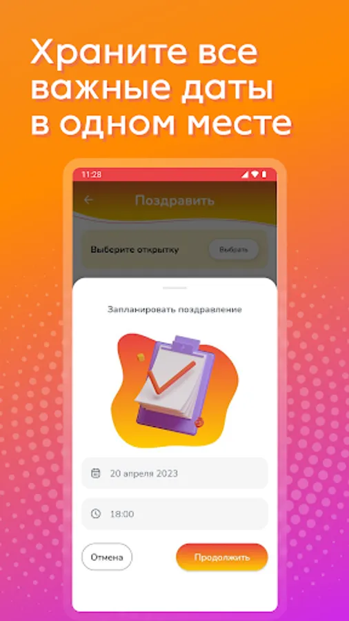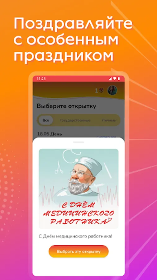 We have done everything so that you do not spend a lot of time on congratulations: we are constantly updating the database of postcards, actual gifts and convenient features. Check out all the features of the app!